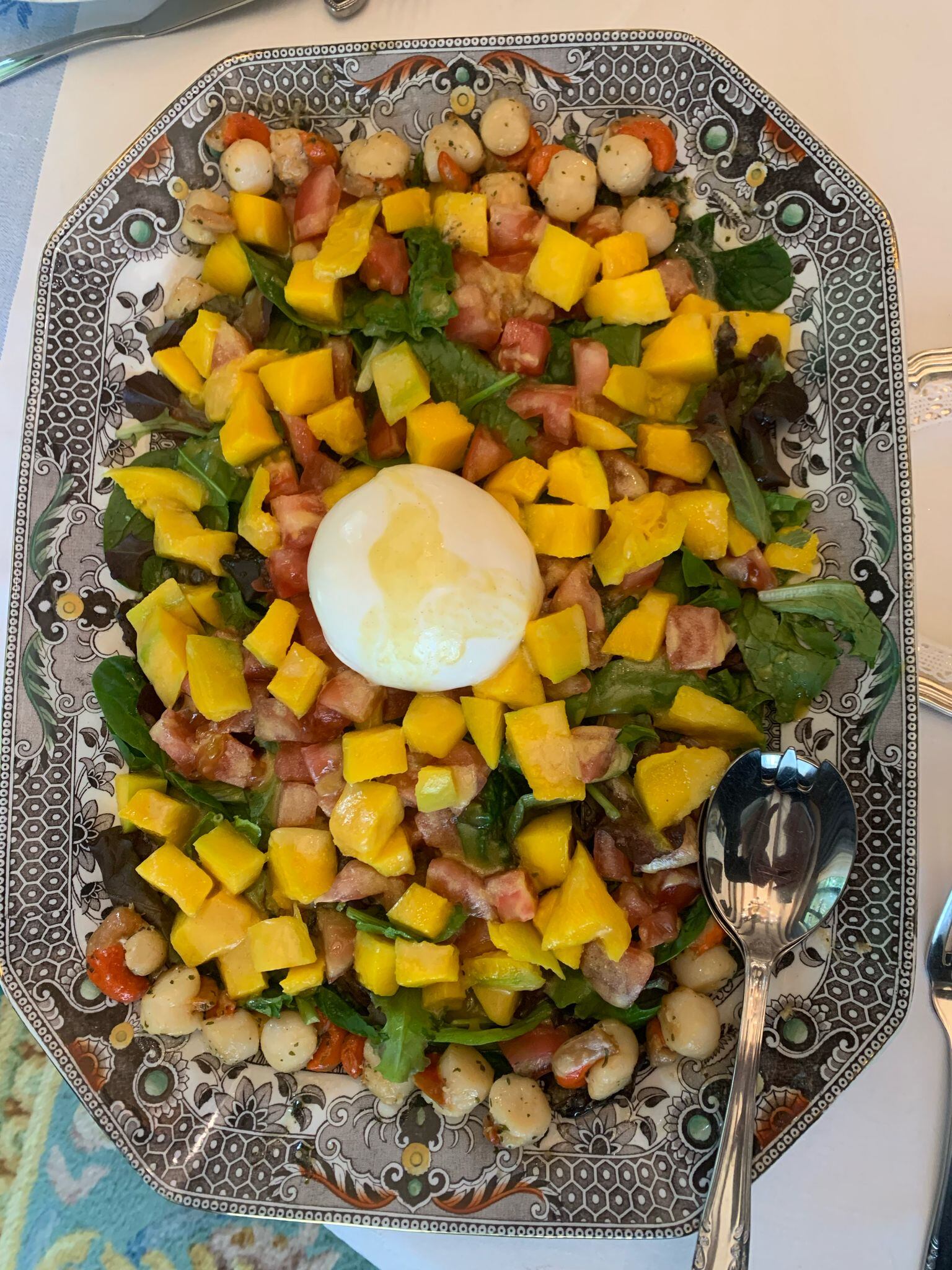 Se ponen en el fondo de la Fuente los brotes tiernos, la lechuga picada o la verdura que quieras, encima los tomates pelados y picados en cuadraditos, el mango también pelado y en cuadraditos, se añade un poco de sal, se coloca en el centro la burrata, se pasan las zamburiñas por la sartén 2 minutos con un picadora de ajo y perejil y se colocan a los lados.