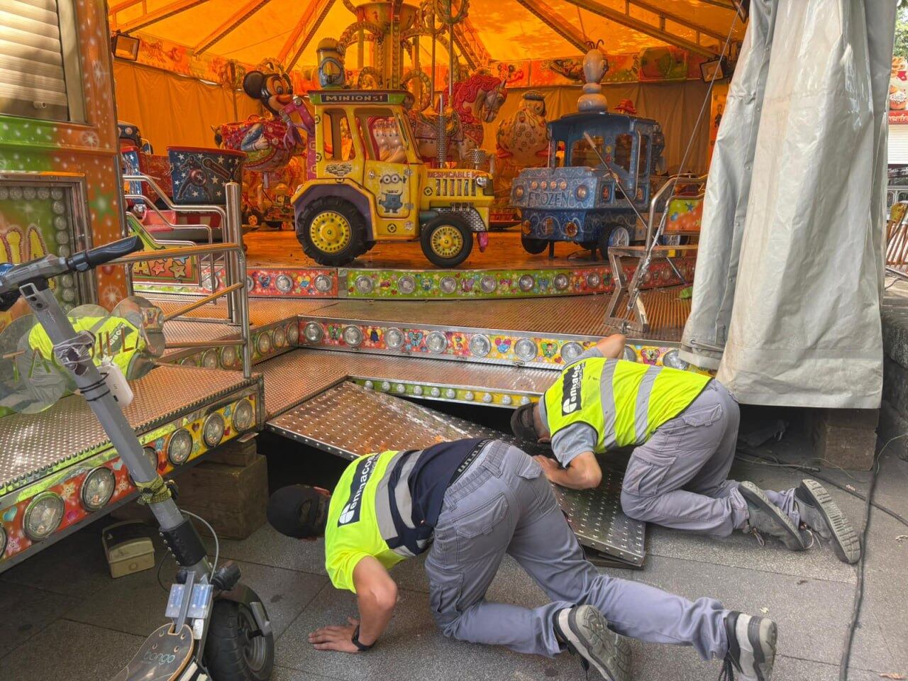 El trabajo termina con una revisión del estado de las instalaciones eléctricas y de su correcto funcionamiento, incluyendo pruebas y ensayos de seguridad. Por lo tanto, no se extrañen si a lo largo de la jornada no se extrañen si ven funcionar atracciones sin nadie a bordo.