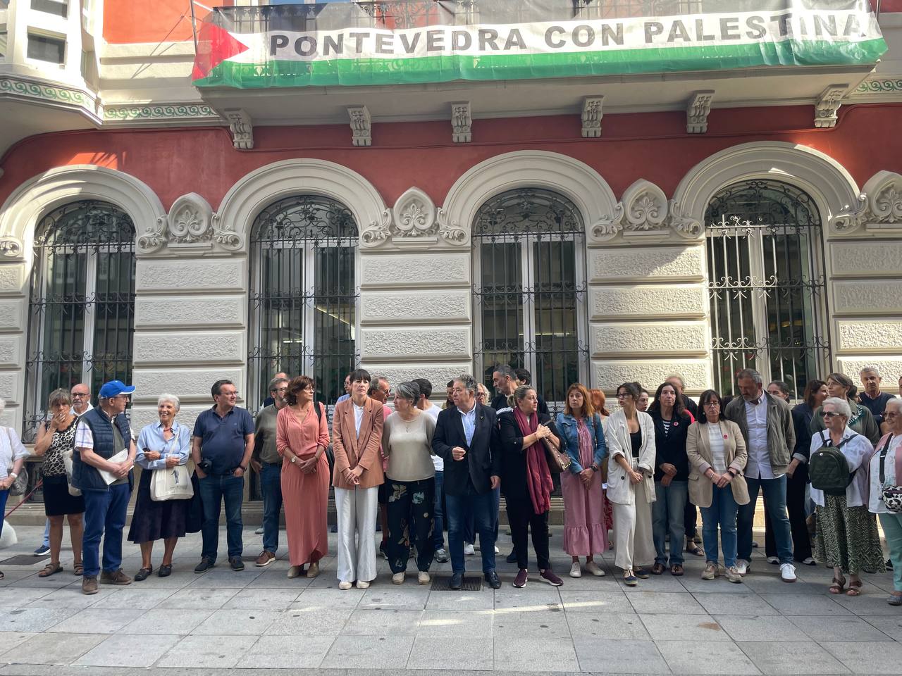 Esta mañana la FEGAMP, la Federación Galega de Municipios e Provincias, ha convocado un minuto de silencio para mostrar su apoyo a Palestina. Ha tenido lugar en el exterior del edificio administrativo del Concello de Pontevedra, bajo la pancarta de apoyo a Palestina. Hasta allí se han desplazado representantes de los tres partidos, PSOE, PP y BNG y entre los asistentes se encontraba la portavoz nacionalista Ana Pontón, y también el alcalde Fernández Lores, quien explicó que unirse a este tipo de convocatorias es lo mínimo que se puede hacer para mostrar el apoyo a Palestina.