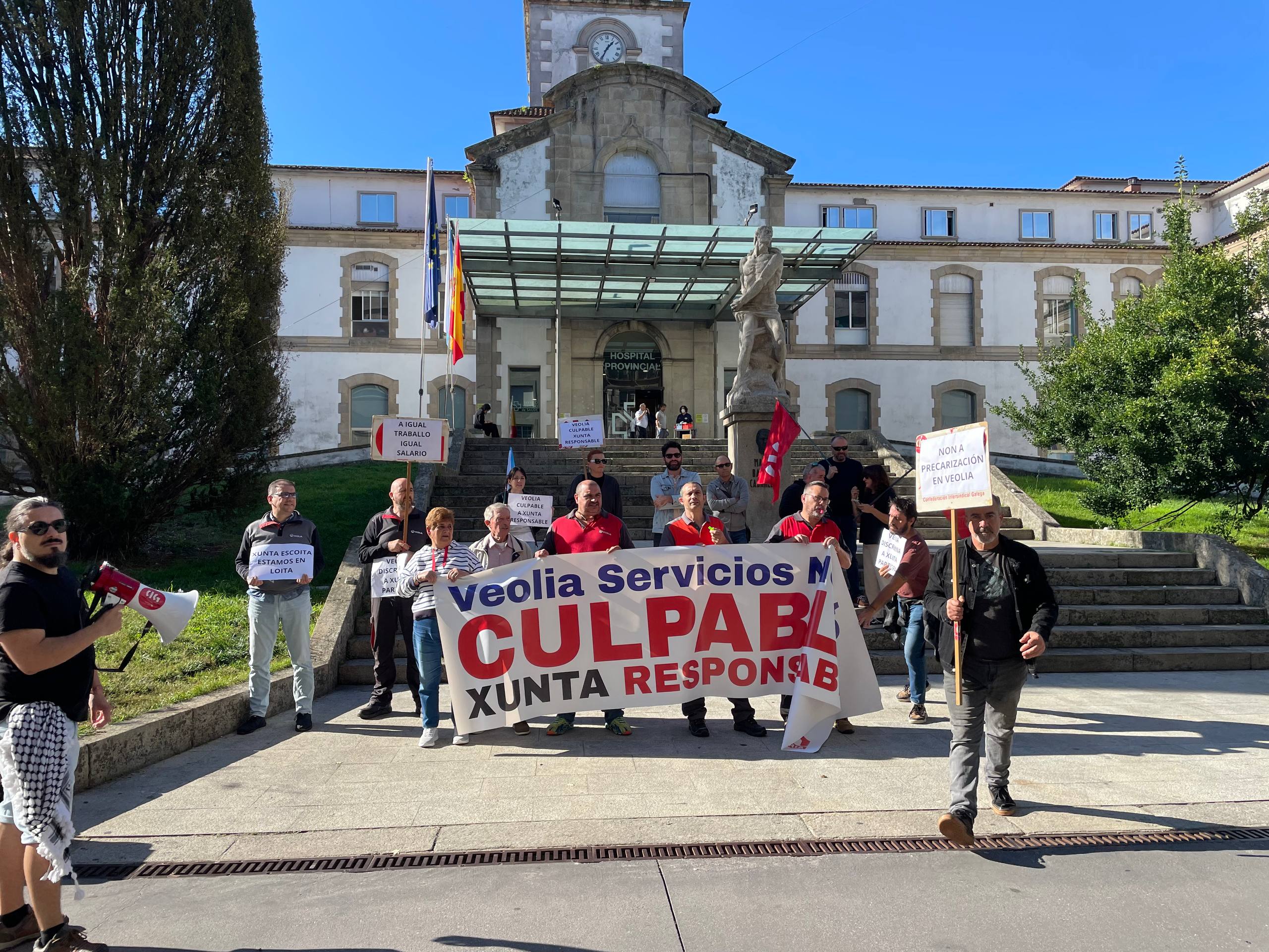 El plantel de Veolia, concesionaria del servicio de mantenimiento del hospital Provincial de Pontevedra, se concentró esta mañana ante de la puerta principal del Hospital Provincial de Pontevedra para reclamar una serie de mejoras laborales.