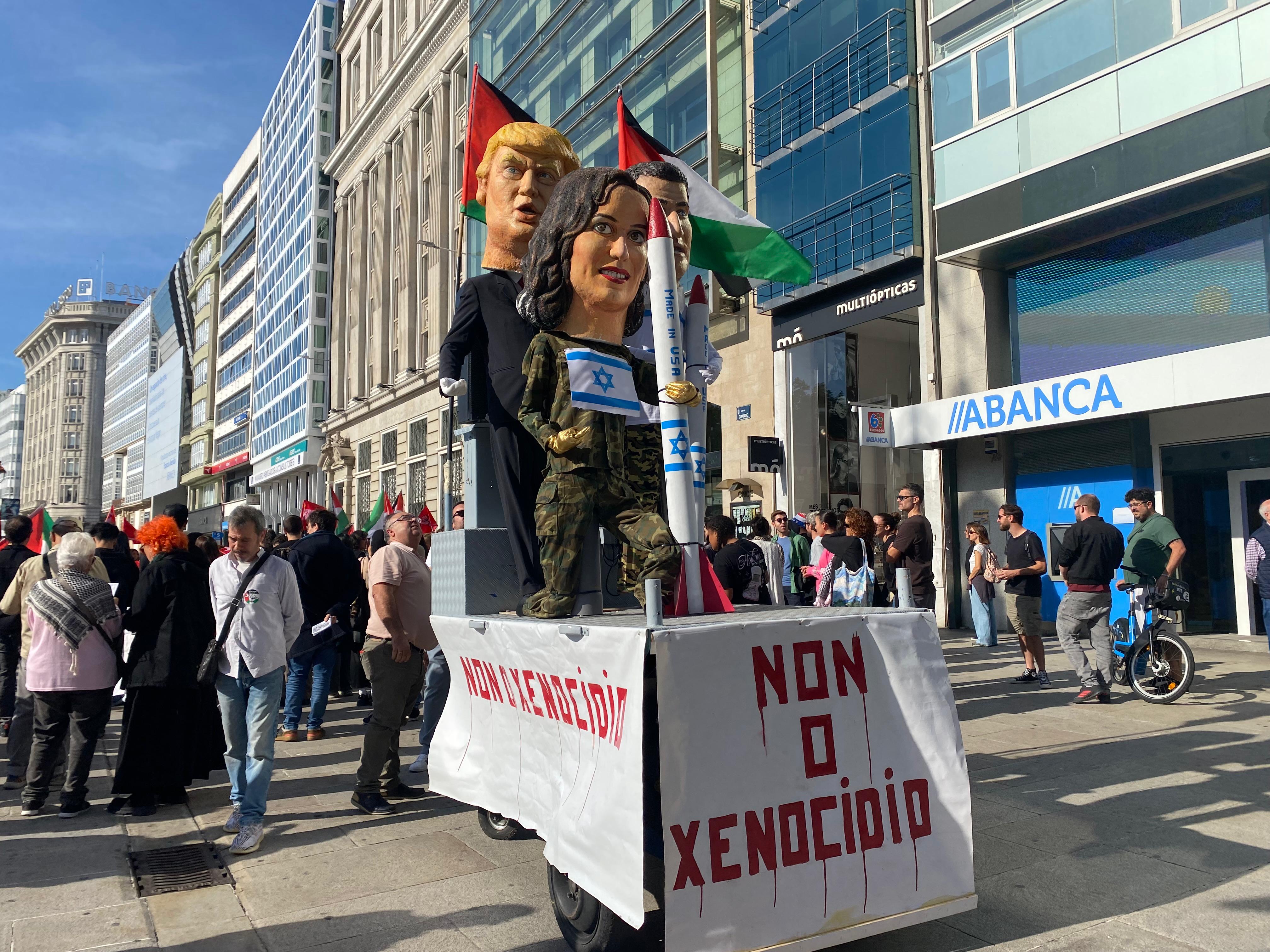 Cabezudos con misiles y las caras de Ayuso, Feijóo y Trump, bajo la bandera de Israel, encabezan la manifestación del Sindicato de Estudiantes en A Coruña