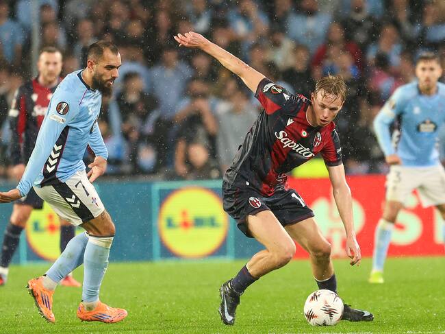 VIGO, 11/12/2025.- El delantero del Celta Borja Iglesias (i) persigue a Jonathan Rowe, del Bolonia, durante el partido correspondiente a la jornada 6 de la fase de grupos de la Liga Europa que Celta de Vigo y Bolonia FC disputan este jueves en el estadio de Balaídos, en Vigo. EFE/ Salvador Sas / Salvador Sas (EFE)