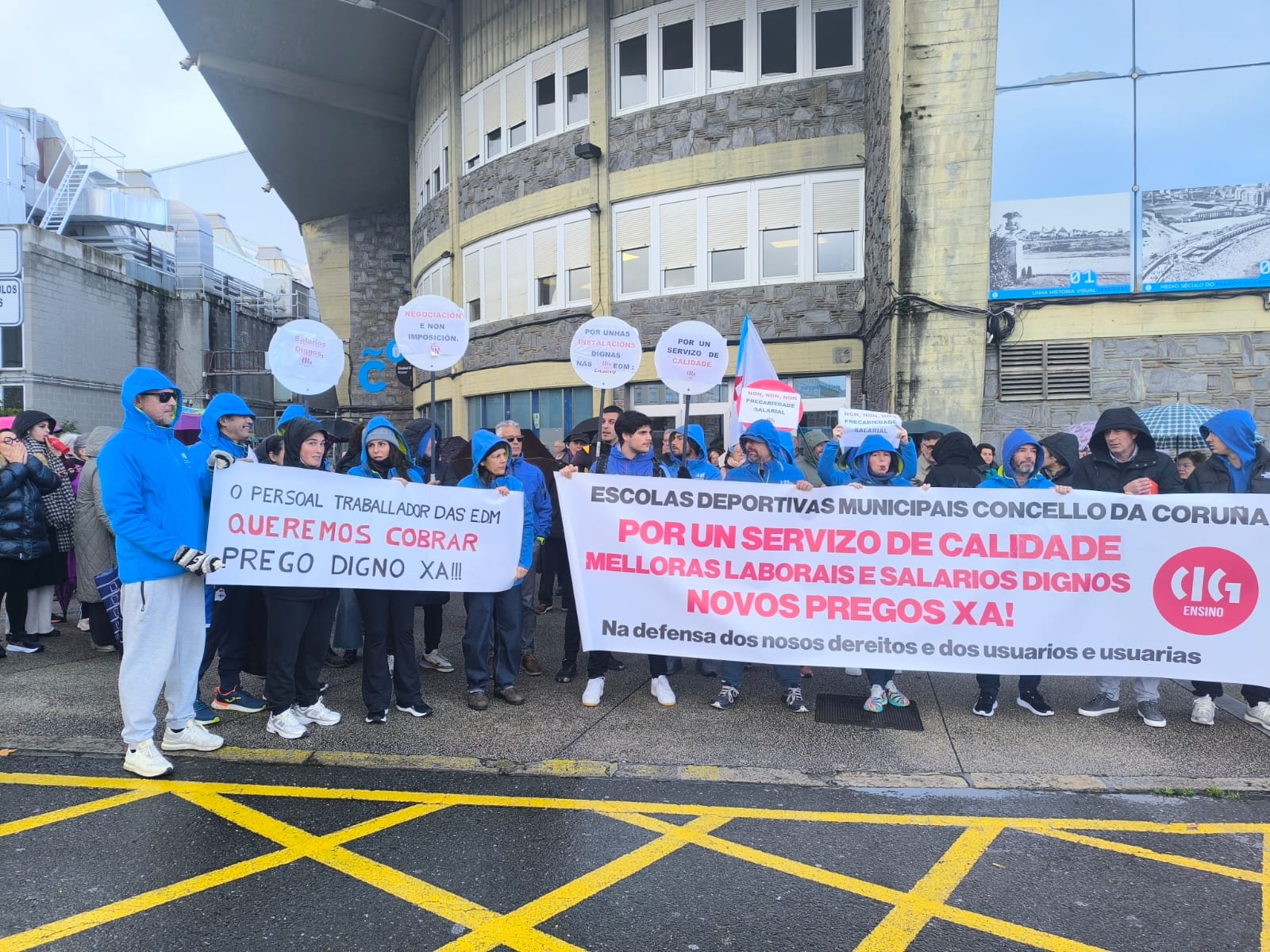 Este viernes, el personal de las escuelas deportivas municipales se concentró en el Palacio de los Deportes de Riazor, desafiando la lluvia y el viento, para visibilizar su situación. A la protesta se sumaron también decenas de usuarios y usuarias de las instalaciones deportivas, en apoyo a las reivindicaciones del colectivo.