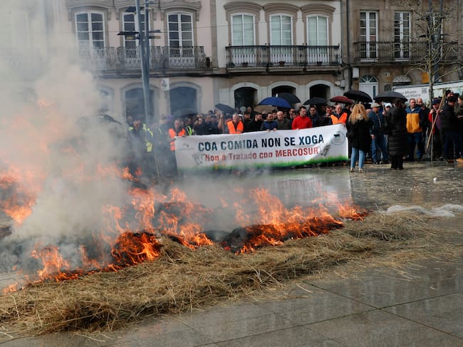 LUGO, 14/01/2026.-Quema de paja a las puertas de la Diputación Provincial de Lugo durante la protesta de agricultores contra el tratado comercial de la Unión Europea con Mercosur. Por segundo día consecutivo, decenas de tractores volvieron a provocar este martes retenciones y atascos en el centro de Lugo, con motivo de esa protesta convocada por las organizaciones Agromuralla -que agrupa a productores de leche de las provincias de Lugo y A Coruña- y Gandeiros Galegos da Suprema -ganaderos que producen carne de Ternera Gallega Suprema-. EFE/ Pedro Eliseo Agrelo Trigo / Pedro Eliseo Agrelo Trigo (EFE)
