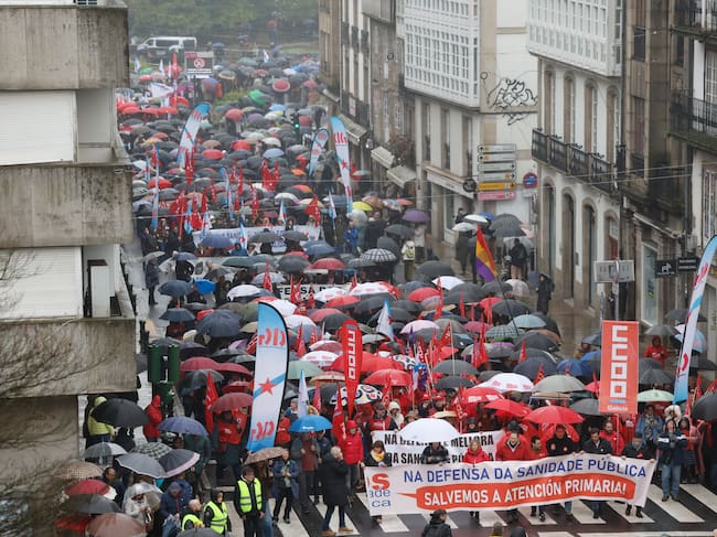 SANTIAGO DE COMPOSTELA, 01/02/2026.- Miles de personas han participado este domingo en la manifestación convocada por la plataforma SOS Sanidade Pública en Santiago de Compostela en defensa del sistema sanitario público y en contra de los "recortes" de la Xunta de Galicia en materia de salud. EFE/ Lavandeira Jr / Lavandeira jr (EFE)