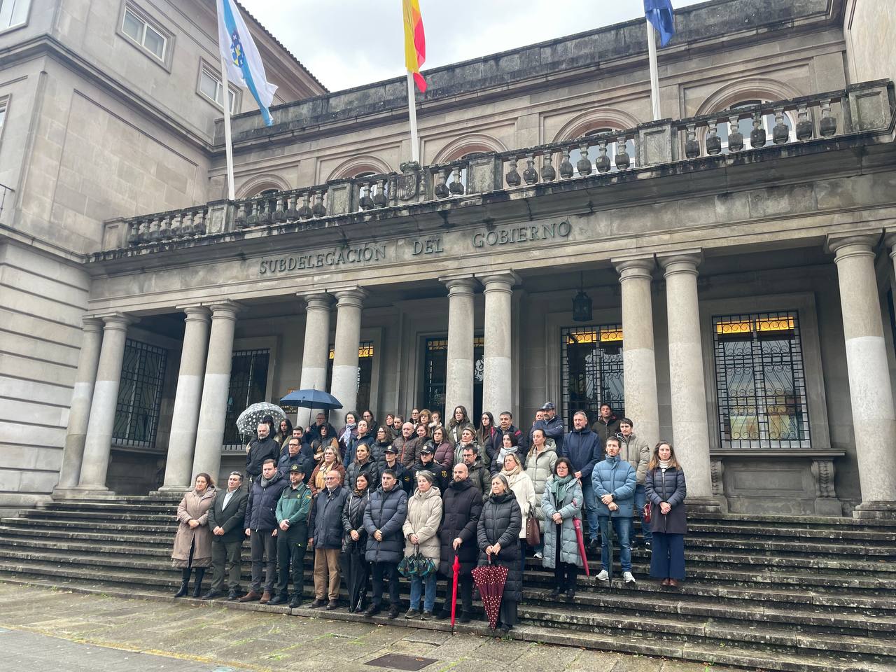 En la Subdelegación del Gobierno en Pontevedra y pasadas las 13:30 horas de este mediodía más de medio centenar de personas con el delegado del Gobierno, Pedro Blanco, a la cabeza, guardaron un minuto de silencio ante el primer crimen machista en Galicia de este 2026. Bajo los paraguas y a pocos segundos de que rompiese a granizar, representación municipal, provincial y estatal condenó el asesinato machista de María Belén, de 52 años y vecina de Mos. La víctima fue presuntamente asesinada por su expareja este domingo, a quien después de atrincherarse en la casa de él, los agentes encontraron muerto.