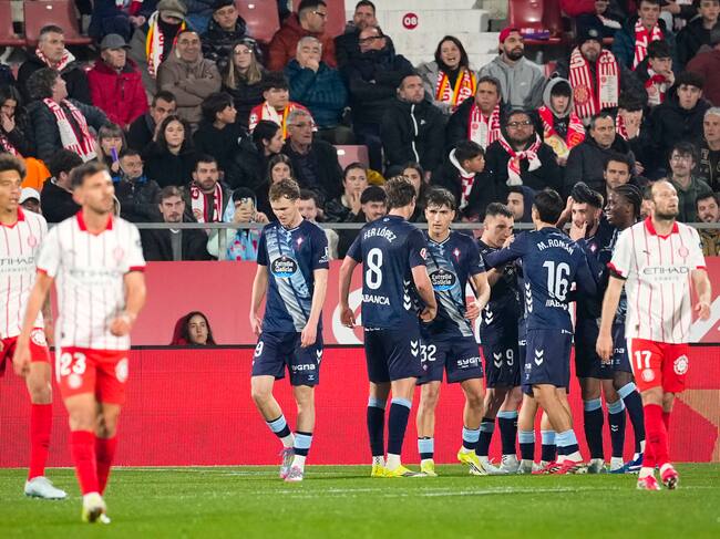 GIRONA, 01/03/2026.- Los jugadores del Celta celebran el 1-2, durante el partido de LaLiga de fútbol que Girona FC y Celta de Vigo disputan este domingo en el estadio municipal de Montilivi. EFE/David Borrat / David Borrat (EFE)