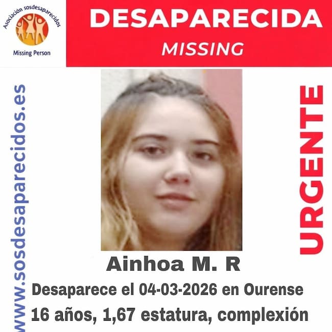 La asociación SOS Desaparecidos ha activado una alerta para localizar a Ainhoa M. R., una menor de 16 años que permanece desaparecida desde el pasado 4 de marzo de 2026 en Ourense.