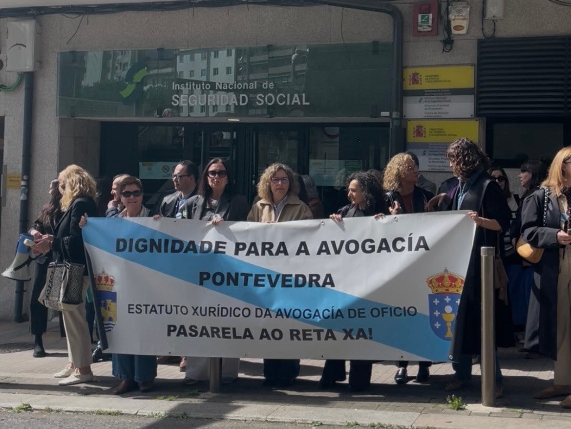 Los abogados del turno de oficia se han concentrado este mediodía frente al Instituto Nacional de la Seguridad Social en Pontevedra. El grupo de letrados de la Plataforma Dignidade Avogacía Pontevedra secundó las protestas que se llevaron a cabo en otras muchas ciudades españolas, pidiendo que los años cotizados en mutualidades sean transferidos de manera íntegra a la Seguridad Social. Los profesionales de la abogacía denuncian que se impida el traspaso de fondos desde las mutuas privadas al RETA (Régima Especial de Trabajadores Autónomos).
