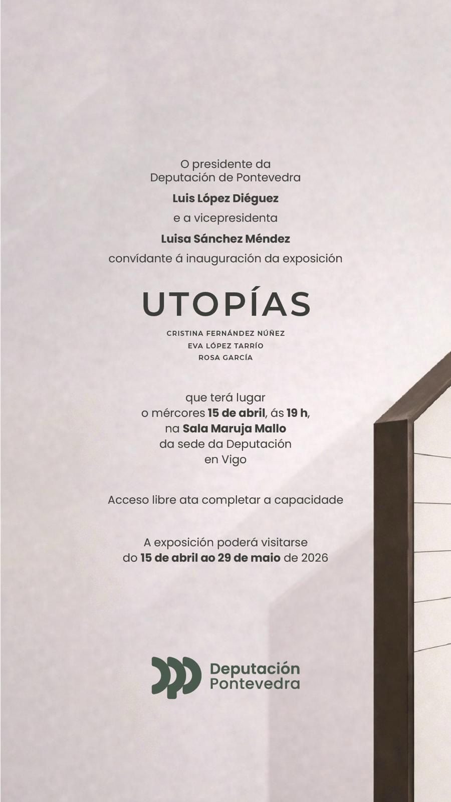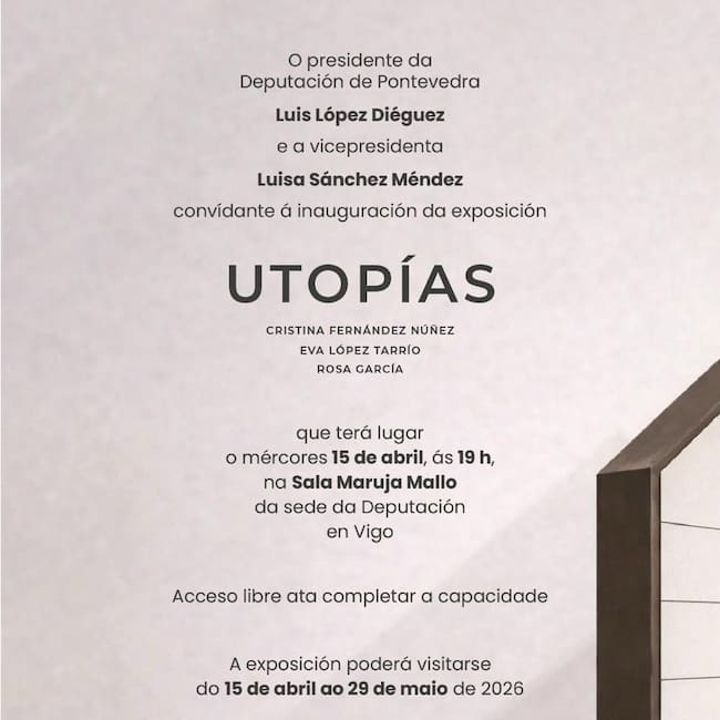 La Diputación de Pontevedra inaugura este miércoles 15 de abril en Vigo la exposición Utopías, una propuesta artística que reúne el trabajo de las creadoras Cristina Fernández Núñez, Eva López Tarrío y Rosa García.
