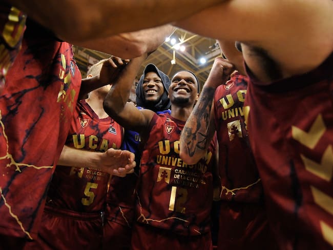 La plantilla del UCAM celebrando la victoria ante Joventut / Javier Bernal