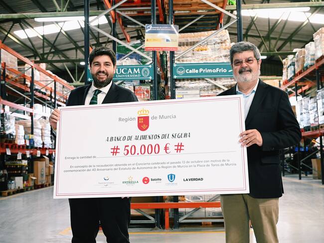El presidente de la comunidad autónoma, Fernando López Miras, ha hecho entrega este viernes de una donación de 50.000 euros al Banco de Alimentos, fruto de la recaudación del concierto solidario organizado por el Ejecutivo con motivo de los 40 años de la aprobación del estatuto de autonomía de la región.