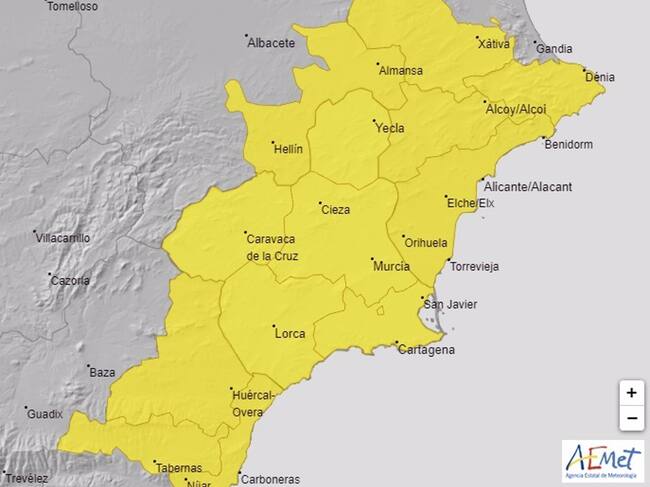 La Agencia Estatal de Meteorología (Aemet) mantiene sus avisos de fenómenos meteorológicos adversos de nivel amarillo para este lunes por lluvias y tormentas en toda la Región de Murcia, entre las 11.00 y las 22.00 horas. En concreto, se prevé una precipitación acumulada de hasta 20 litros por metro cuadrado en una hora en el Valle del Guadalentín, Lorca y Águilas, Campo de Cartagena y Mazarrón.