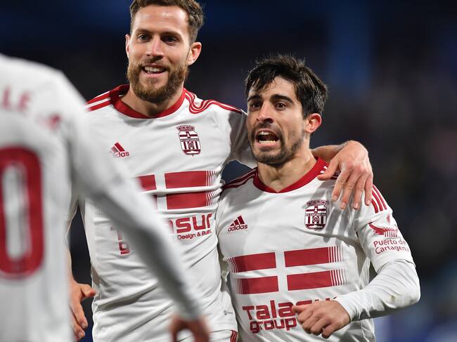 Calero y Jairo, con contrato, celebran un gol esta temporada / FC Cartagena