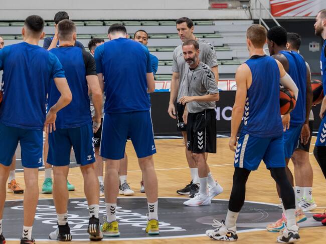 MURCIA, 15/09/2023.- El entrenador de UCAM Murcia C.B Sito Alonso (c) da instrucciones a sus jugadores durante el entrenamiento este viernes previo a la Supercopa de baloncesto que se va ha celebrar este fin de semana en el Palacio de los Deportes de Murcia. EFE/Marcial Guillén / Marcial Guillén (EFE)