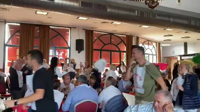 Entre plato y plato, los trabajadores animan el salón.