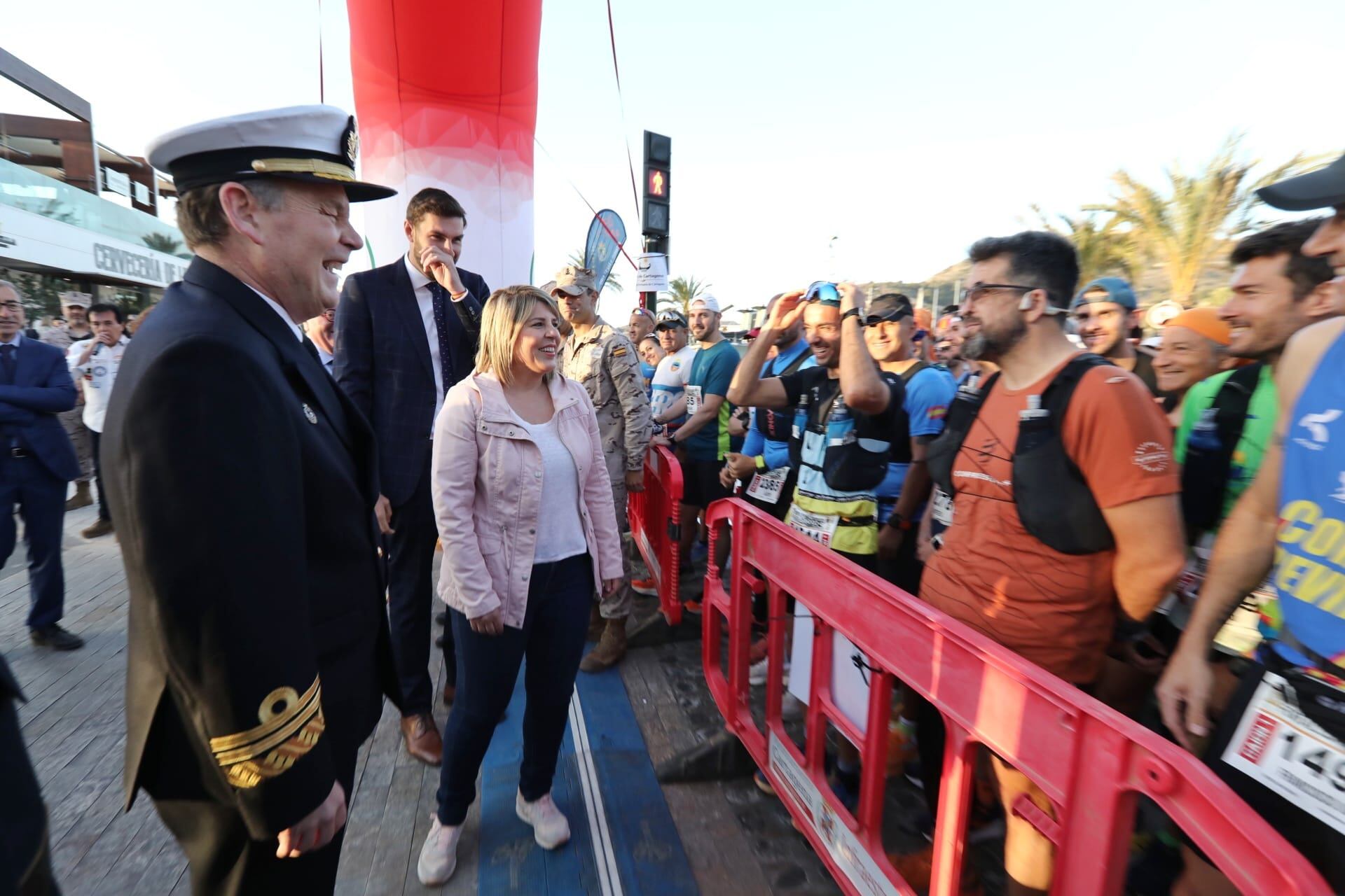La salida de la Ruta de las Fortalezas se inició con el izado de la bandera de España en el puerto de Cartagena a las ocho de la mañana. El pistoletazo inicial contó con la participación de la alcaldesa, Noelia Arroyo, el almirante de Acción Marítima, vicealmirante Victoriano Gilabert, el vicepresidente autonómico, José Ángel Antelo, el teniente alcalde Diego Salinas y el concejal de Deportes, José Martínez.
