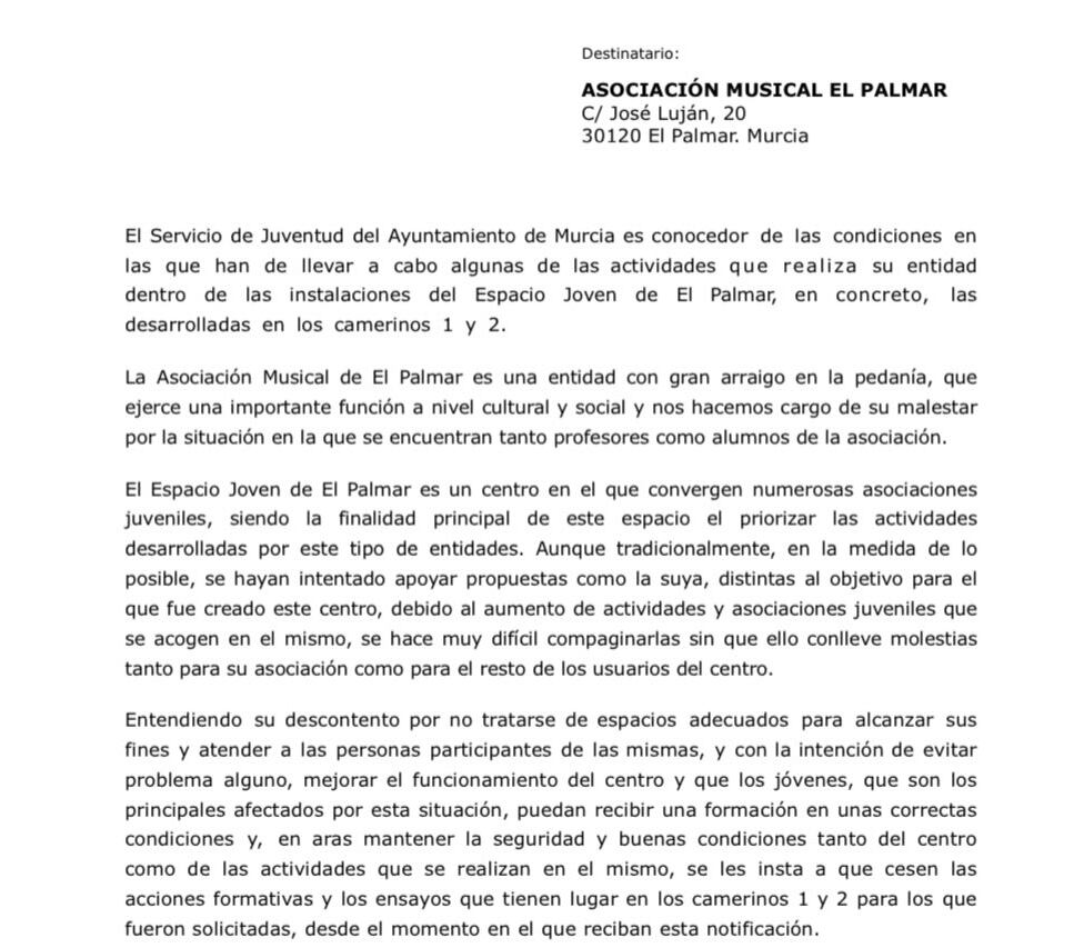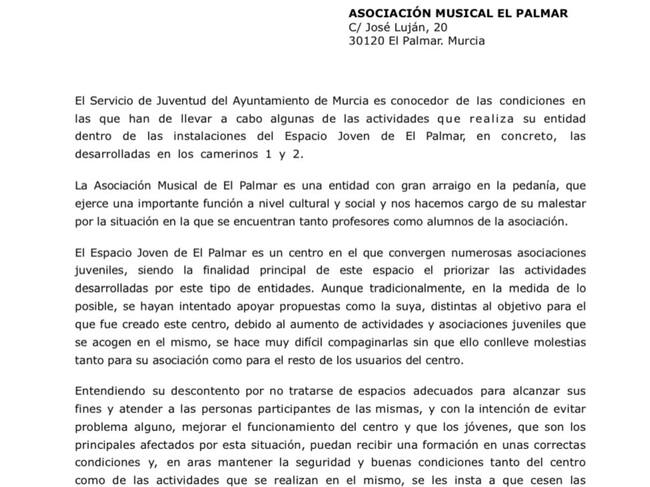 La Asociación ha hecho pública una carta del jefe de servicio de Juventud del consistorio en la que dice que entiende el malestar de la Asociación Musical por las condiciones en las que se encuentran profesores y alumnos de la entidad, y alega que esta actividad es muy difícil de compaginar con las actividades de las asociaciones juveniles que hacen uso del centro. Por ello, les insta a que cesen sus acciones formativas y sus ensayos.
