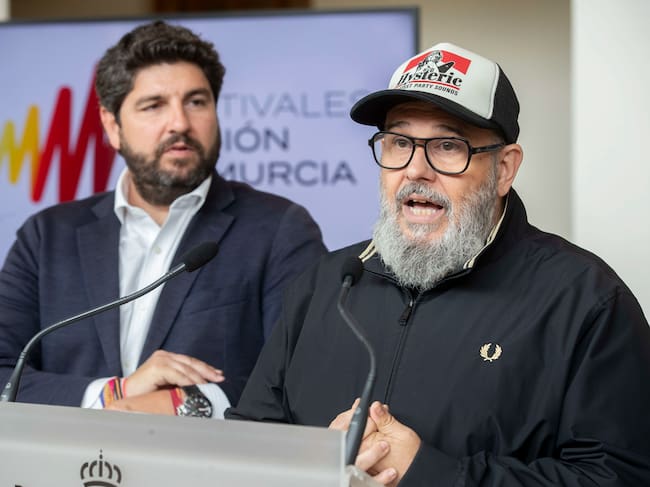 MURCIA, 29/04/2024.- El director del festival "?Warm Up Estrella de Levante", José Manuel Piñero (d), junto al presidente de la Comunidad de Murcia Fernando López Miras (i), durante la presentación del Festival que se celebrará los días 3 y 4 de Mayo, este lunes en el Auditorio Víctor Villegas de Murcia. EFE/Marcial Guillén / Marcial Guillén (EFE)