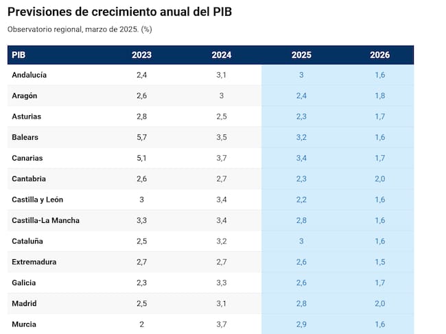 Para 2026, BBVA Research prevé un frenazo en el crecimiento debido, en el caso de la Región, por la consolidación fiscal, que puede "limitar el avance" de comunidades "donde el peso de las administraciones públicas es mayor" como Extremadura, Andalucía o la Región de Murcia para la que prevé un crecimiento de un 1,6 por ciento.