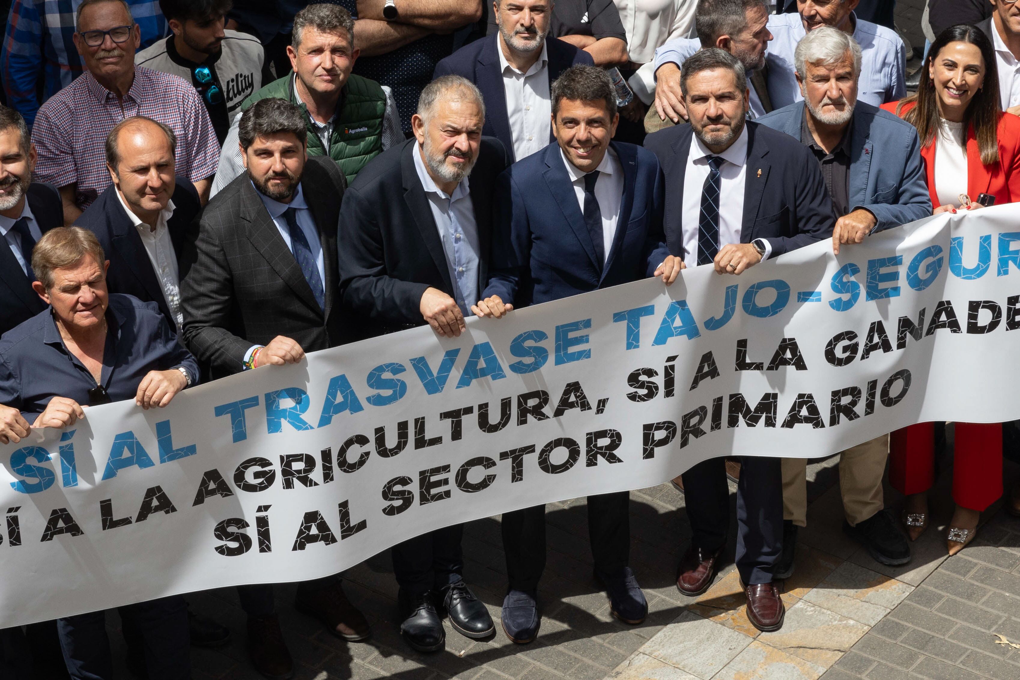 MURCIA, 06/05/2025.- El presidente del Sindicato Central de Regantes del Acueducto Tajo-Segura (Scrats), Lucas Jiménez (4i); el presidente de la Comunidad Valenciana, Carlos Mazón (4d); el presidente de la Región de Murcia, Fernando López Miras (3i); el presidente de los empresarios murcianos, Miguel López Abad; y el consejero de Agricultura, Pesca, Agua y Desarrollo Rural de Andalucía, Ramón Fernández-Pacheco, entre otros, posan durante el acto de protesta contra las nuevas reglas de explotación del trasvase Tajo-Segura, convocado por el Scrats, este martes en la Cámara de Comercio de Murcia. EFE/Marcial Guillén / Marcial Guillén (EFE)