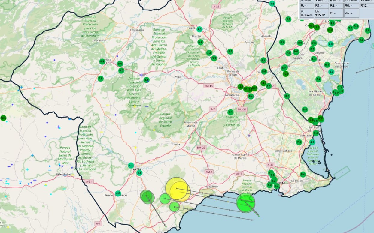 Las lluvias también han sido significativas en otras localidades como Librilla, Alguazas y Caravaca de la Cruz, donde se han superado los 15 litros por metro cuadrado. Municipios como Molina de Segura, Lorca, Puerto Lumbreras, Mazarrón y Totana también han registrado cantidades cercanas.