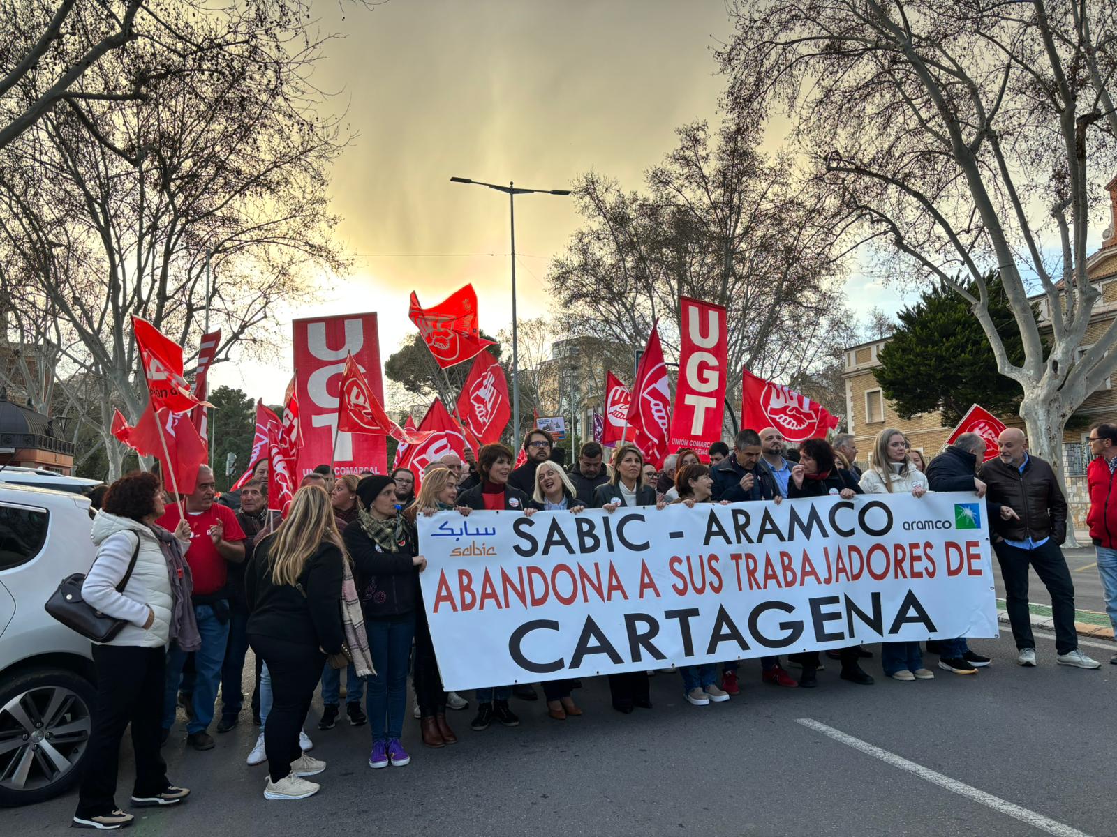 La manifestación, que ha partido desde la Plaza de España para recorrer el corazón de la ciudad, ha unido a trabajadores de la planta de SABIC, empleados de la industria auxiliar y ciudadanos en una defensa cerrada del futuro industrial de la comarca. La fecha elegida no ha sido casual: los convocantes han querido que la marcha coincida con el 3 de febrero, el día en que se recuerda la quema de la Asamblea Regional en 1992, símbolo del conflicto social que desangró a la ciudad en los noventa.