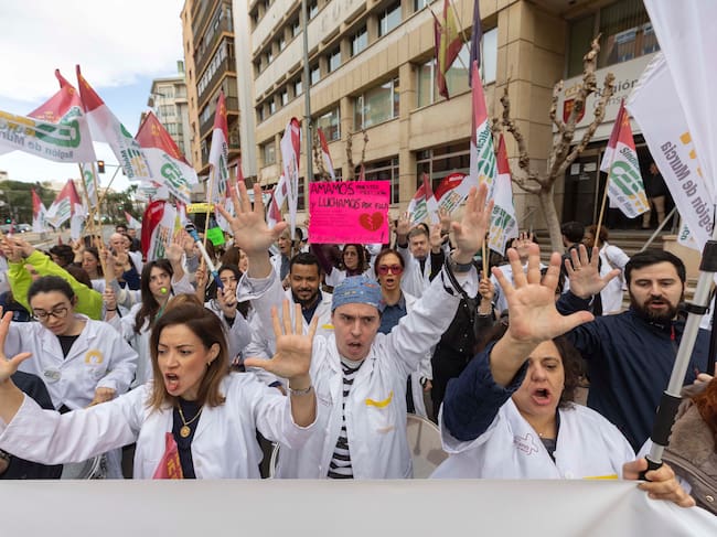 MURCIA, 16/02/2026.- Centenares de médicos se han concentrado este lunes frente a la Consejería de Salud de Murcia en el primer día de huelga que se mantendrá hasta el viernes. EFE/Marcial Guillén / Marcial Guillen (EFE)
