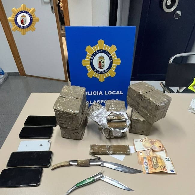 La actuación policial se saldó con la aprehensión de un total de 5,5 kilogramos de hachís, distribuidos en tabletas preparadas presuntamente para su distribución, así como la incautación de armas blancas encontradas durante la intervención.