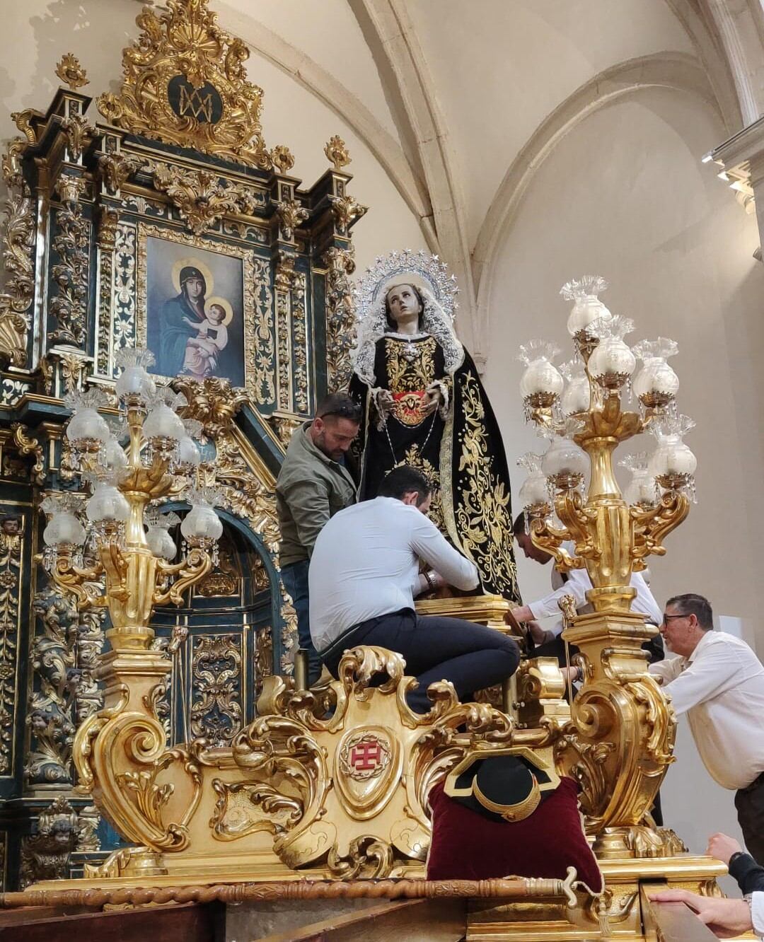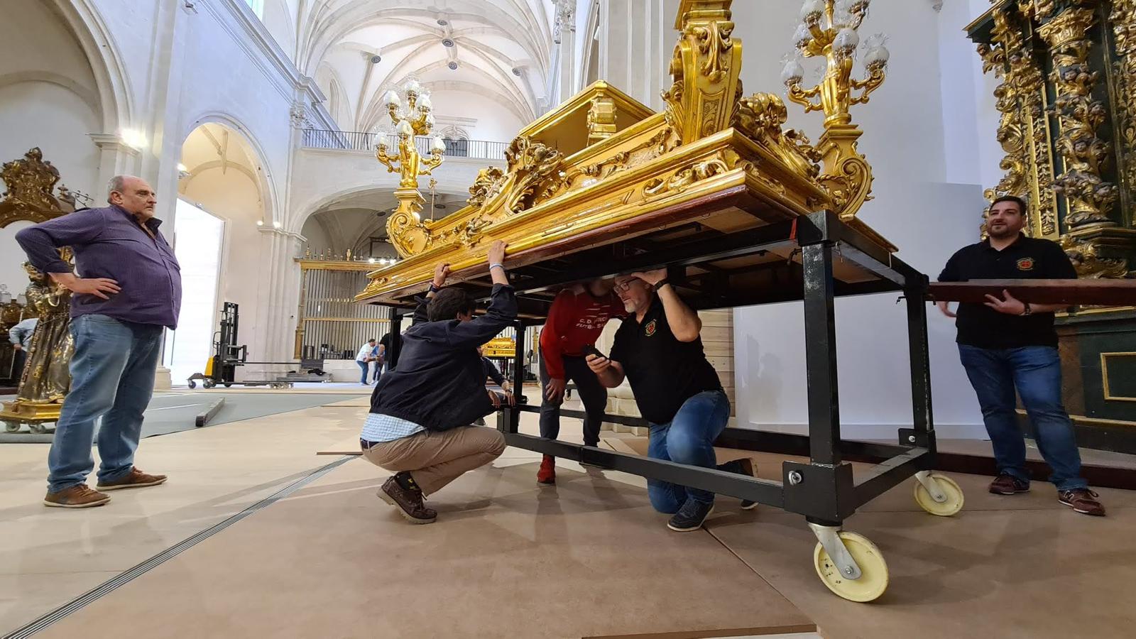 Los tronos, que están tapados y guardados durante todo el año, se destapan, se limpian, se revisan faroles, se recarga cera líquida y se activan los preparativos eléctricos. Gracia explica que esta misma semana ya tiene que trasladar el trono restaurado de la Misericordia, instalar la electricidad y preparar el Nazareno para su procesión. Detrás de cada paso hay un método, un orden y una semana entera de trabajo que debe estar resuelta antes de que llegue la gran cita.