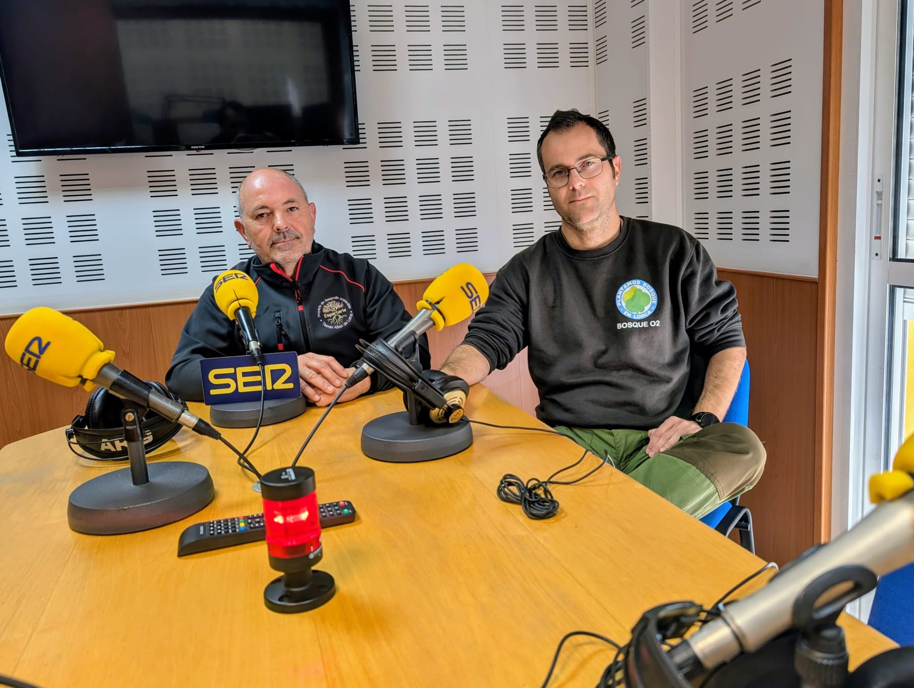 De izda a derecha: Miguel Plazas y Pedro Quiñonero de la Plataforma por la Calidad del Paisaje en los estudios de Radio Lorca SER. / Radio Lorca SER