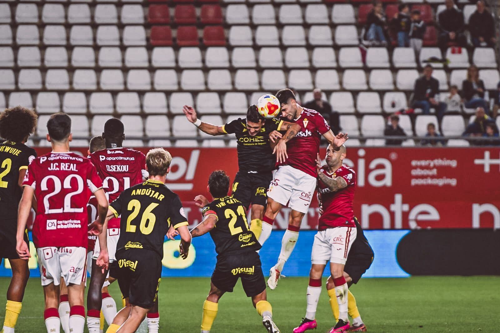 El primer 11 de curro Torres en el estadio Enrique Roca dejó varias novedades. La nueva suplencia de David Flakus, la vuelta a la punta de Pedro Benito, y la reincorporación de Juan Carlos, Real al esquema titular. Sin el sancionado, Palmberg, ni los lesionados Héctor y Moyita, el entrenador tenía una difícil tarea: volver a ganar en casa.Pero desde el inicio, las cosas salieron mal dadas para el Murcia. El Real Murcia no entró cómodo al terreno de juego y no pudo transitar con la comodidad que pretendía Torres. En un centro desde la derecha, Agustin Juárez remató con la puntera para adelantar al equipo visitante en puestos de descenso (0-1). El rostro de los futbolistas locales era un poema, que cariacontecidos contemplaban la situación. Después del gol, le costó mucho volver a entrar al Real Murcia. En 20 minutos, ni siquiera fue capaz de disparar a portería. Pero cercana a la media hora de juego, Juan Carlos, Real, el faro del equipo filtrando balones desde la media punta, habilitó a Jorquera para que esté combinara con Pedro Benito y anotara el empate. Eso sí, la colegiada Olatz Rivera anuló el tanto.Mejores sensaciones tenían los andaluces, que replegados atrás, robaron en diversas ocasiones aprovechando la poca finura de salida de balón de los pimentoneros.Y aunque la sensaciones fueron nefastas, al borde del descanso en Murcia reaccionó y tuvo diferentes ocasiones. Primero un disparo dentro del área de narro muy peligroso y después un balón al palo de Jorge Mier. Pero eso solo significaba que la pólvora del Murcia, era incapaz de compenetrarse y tener continuidad.Torres agitó el árbol e introdujo a Flakus e Isi Gómez al descanso. En la segunda parte, la imagen del Murcia debía ser radicalmente diferente. Pero ni con esas, ya que la apatía del equipo que falta algo, inoperante, reflejó el nerviosismo. Entró Juanto Ortuño y también Álvaro Bustos, pero tan solo una ocasión del delantero yeclano tuvo el aficionado grana para echarse a la boca en la segunda parte.
