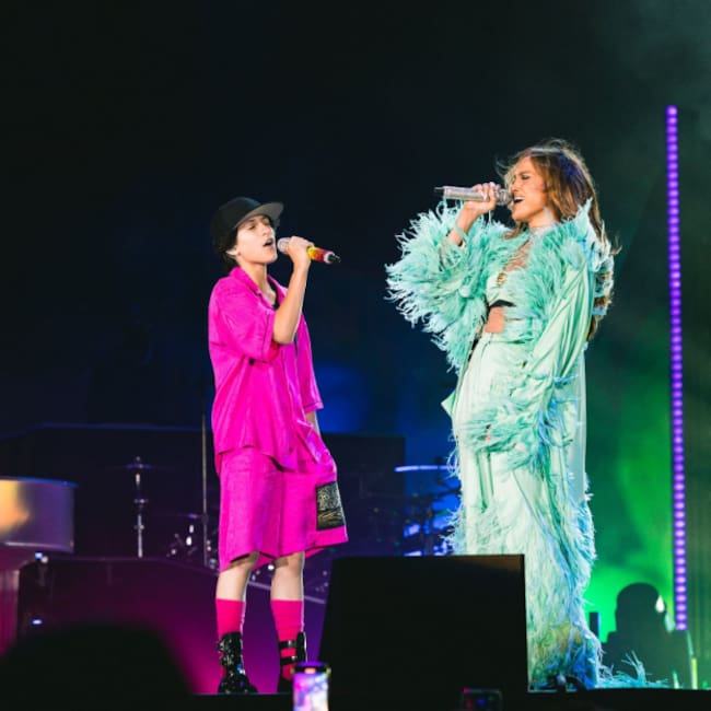"La última vez que actuamos juntes fue en un gran estadio como este y ahora le pido que cante conmigo todo el tiempo y nunca quiere. Así que esta es una ocasión muy especial", sentenció López antes de emocionar a todo el público con el dueto. Madre e 'hije' cantaron la canción A Thousand Year, de Christina Perri, Let's Get Loud, de la propia Jennifer, y Born in the USA, de Bruce Springsteen, la cual ya habían cantado juntes en la SuperBowl.