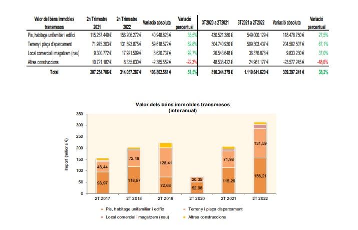 Quant a les transmissions de béns immobles pròpiament, aquí es confirma que el sector està en clara expansió, ja que en el segon trimestre d'enguany s'han tancat 538 operacions referents a l'habitatge, un centenar més que ara fa un any. A més, es confirma la dada més elevada dels darrers cinc anys.