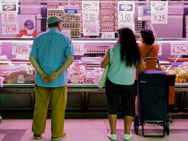 Varias personas espera a ser atendidas en una pollería de un mercado de Madrid. La inflación volvió a subir en julio hasta situarse en el 10,8 % en tasa anual / Luis Millan (EFE)