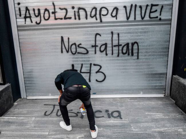 Un manifestante pinta un grafiti en la fachada de la Procuraduría General de la República en Ciudad de México el 25 de septiembre de 2020, durante una protesta en la víspera del sexto aniversario de la desaparición de los 43 estudiantes de la Escuela Normal de Ayotzinapa. / PEDRO PARDO