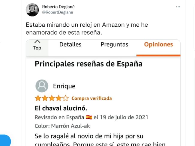 "Se lo regalé al novio de mi hija por su cumpleaños. Porque este sí, este me cae bien". Así comienza la reseña que ha rescatado un usuario de Twitter y que ha arrasado en las redes sociales. Se trata de un comentario que dejó un hombre en Amazon tras haber comprado un reloj de la marca BENYAR.