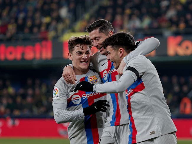 VILLARREAL (CASTELLÓN), 12/02/2023.- El centrocampista del Barcelona Pedri (d) celebra con Robert Lewandowski (c) y Gavi tras marcar ante el Villarreal, durante el partido de Liga en Primera División que Villarreal CF y FC Barcelona disputan este domingo en el estadio de La Cerámica. EFE/Manuel Bruque / Manuel Bruque (EFE)