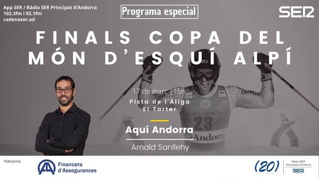 'Aquí Andorra' Especial Finals Copa del Món d'esquí alpí s'emetrà en directe des del peu de la pista de l'Àliga, aquest divendres de 3 a 4 de la tarda i es podrà seguir a través de les freqüències 102.3FM i 92.1FM, per streaming al web www.cadenaser.ad, per l'app SER/Ràdio SER Principat d'Andorra, i a través del canal de Youtube de SER Catalunya, i està patrocinat per Financera d'Assegurances.