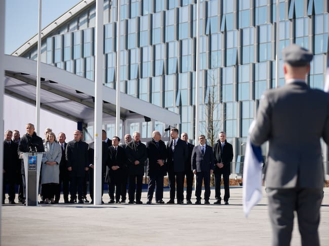La bandera de Finlandia, que oficialmente ya ondea en la sede de la OTAN en Bruselas / JOHANNA GERON / POOL (EFE)