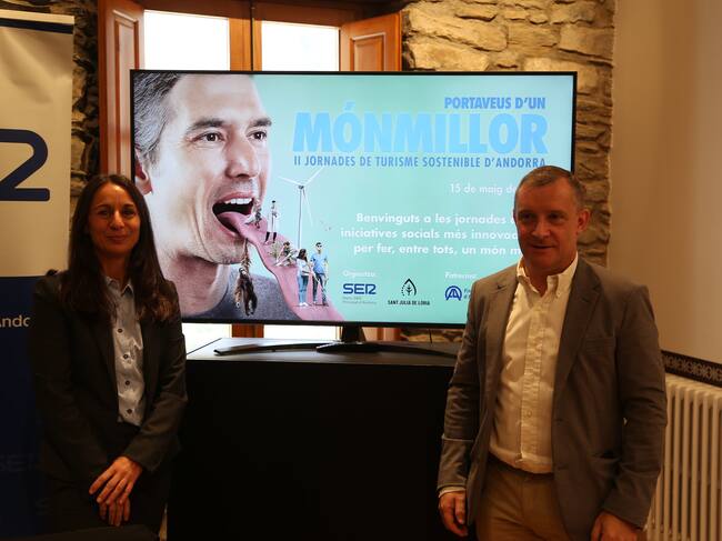 El cònsol major de Sant Julià de Lòria, Josep Majoral, i la directora de Ràdio SER Principat d'Andorra, Marisol Fuentes, en la presentació de la 2a edició de les jornades Un Món Millor. / Comú de Sant Julià de Lòria