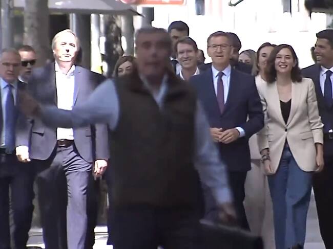 La alegría se apreciaba ampliamente en sus semblantes. Algunos de los principales candidatos de las elecciones municipales y autonómicas del PP se han unido al líder, Alberto Núñez Feijóo, para hacer a pie el último tramo hasta su sede en la madrileña calle Génova. Los medios gráficos se había colocado estratégicamente en un lateral con la suficiente distancia para capar los últimos pasos. Pero en la vía pública no todo puede estar medido. Tanto es así que esa imagen de un paseo distendido de los dirigentes era interrumpida por un viandante que entraba en plano de forma absolutamente casual. A partir de ese momento se puede escuchar a los cámaras y periodistas que gritan: "Fuera, fuera", seguido de contundentes aspavientos con el brazo por parte del protagonista improvisado, que tras quejarse entraba en uno de los portales de la calle.