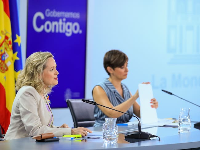La vicepresidenta primera y ministra de Asuntos Económicos y Transformación Digital, Nadia Calviño (i), y la ministra de Política Territorial y portavoz del Gobierno, Isabel Rodríguez, ofrecen una rueda de prensa después de la reunión del Consejo de Ministros este martes / FERNANDO ALVARADO (EFE)