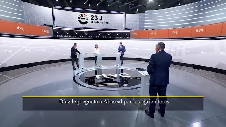 Eran tres en el plató, pero cuatro en el debate. Alberto Núñez Feijóo, el hombre a batir declinó la oferta para confrontar programas en la radiotelevisión pública y en su ausencia la bandera de la derecha la ha portado en solitario Santiago Abascal, que se ha topado con el tandem formado por los candidatos de PSOE y Sumar. Pedro Sánchez ha afeado la ausencia del presidente del PP del que asegura que no ha estado en la cita "porque le da vergüenza aparecer junto a Vox, aunque no le den vergüenza sus votos o sus políticas". Los dos representantes de la izquierda han invocado de forma constante el nombre del candidato popular.