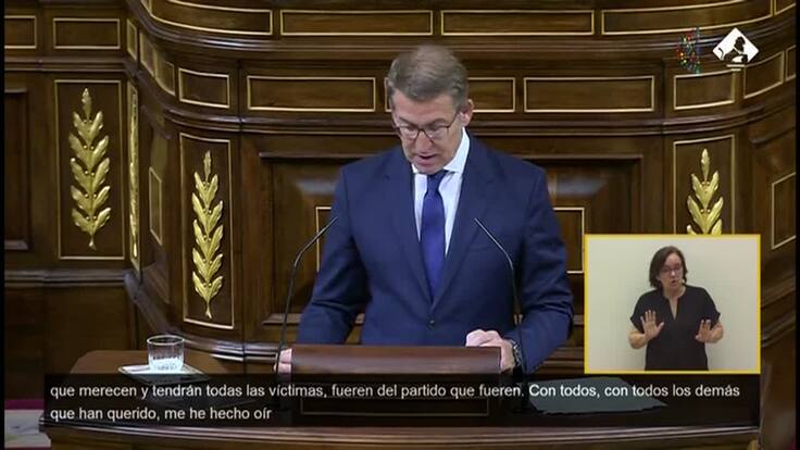 El candidato a la investidura, Alberto Núñez Feijóo, ha comenzado su discurso atacando al PSOE y a su posible pacto con Junts para sacar adelante una ley de amnistía. Considera que "ni el independentismo ni el PSOE pueden pretender que decida por todos los españoles Bildu, con sus condenados por terrorismo, que decida ERC, que hace siempre lo contrario de lo que promete, y que decida Junts, después de escuchar todo lo que ha exigido".