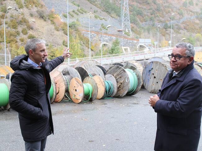 EL director d’Enginyeria de FEDA, Marc Calvet, i el director general de FEDA, Albert Moles, davant la línia d’alta tensió Encamp-La Gonarda-Grau Roig. / Mireia Reynal