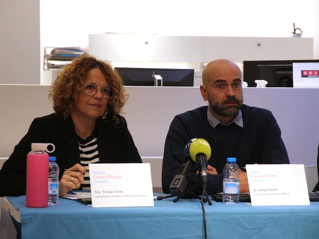 La fins ara cap de projectes del Museu Carmen Thyssen, Teresa Areny, i el gerent, Josep Farràs, durant la presentació de la mostra 'Sons. Analogies musicals a la pintura'. / Mireia Reynal