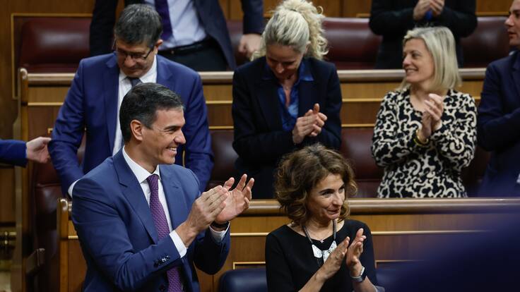 El presidente del Gobierno, Pedro Sánchez, y la ministra de Hacienda, María Jesús Montero, junto al resto de la bancada socialista aplaude la aprobación del dictamen de la ley de amnistía. / Europa Press