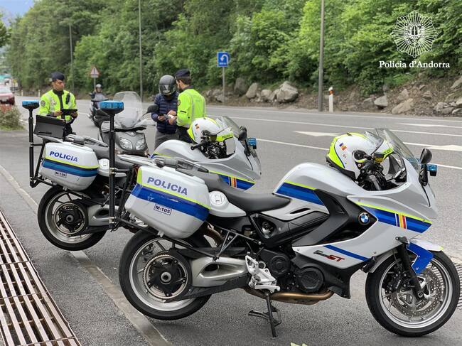 Uns agents efectuant un control preventiu a motocicletes en una campanya de trànsit anterior. A partir de demà, el cos d'ordre efectuarà nous controls / Policia d'Andorra