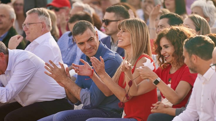El presidente del Gobierno y secretario general del PSOE, Pedro Sánchez, y su mujer, Begoña Gómez, en un mitin en Benalmádena (Málaga) este miércoles. / Europa Press